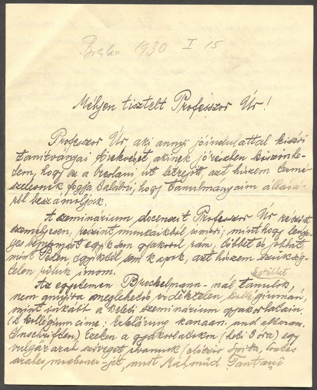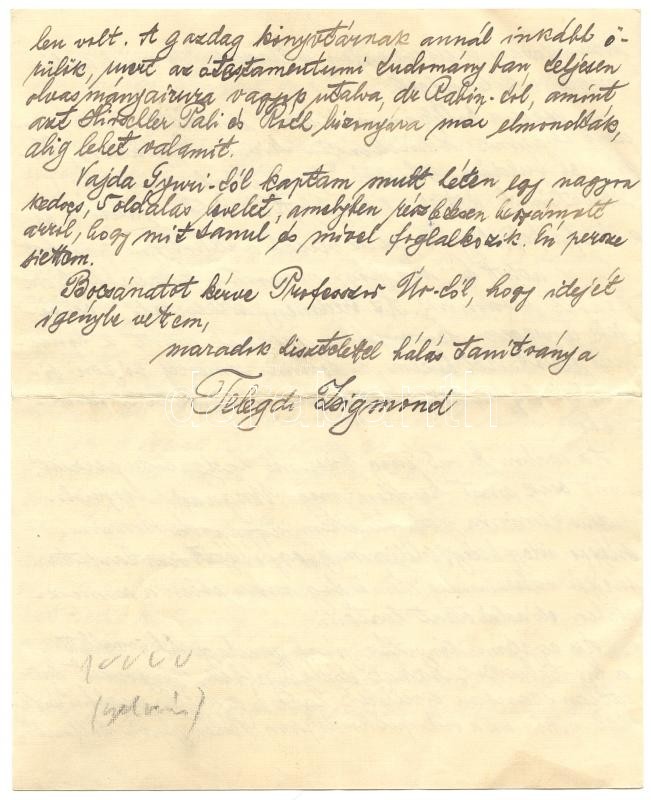 1930 Telegdi Zsigmond iranista és nyelvész saját kézzel írt levele Lyka Károlynak? melyben breslaui tanulmányútjáról számol be. 4 beírt oldal