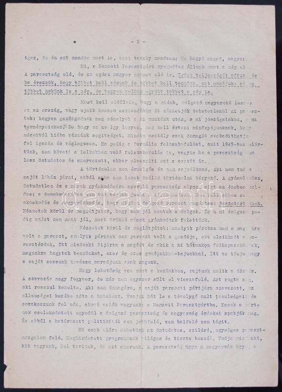 1947 Veress Péter a Nemzeti Parasztpárt elnökének agitáló levele a párt tagjaihoz a választások előtt a politikai teendőkkel. 3 gépelt oldal
