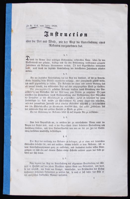 1838 Instruction über die Art und Weise, wie der Arzt die Untersuchung... https://www.darabanth.com/en/178-Online-auction/178.0/Other-collectibles/Military~600006/1838-Instruction-uber-die-Art-und-Weise-wie-der-Arzt-die-Untersuchung-eines-Rekruten-vorzunehmen-h~II629097
