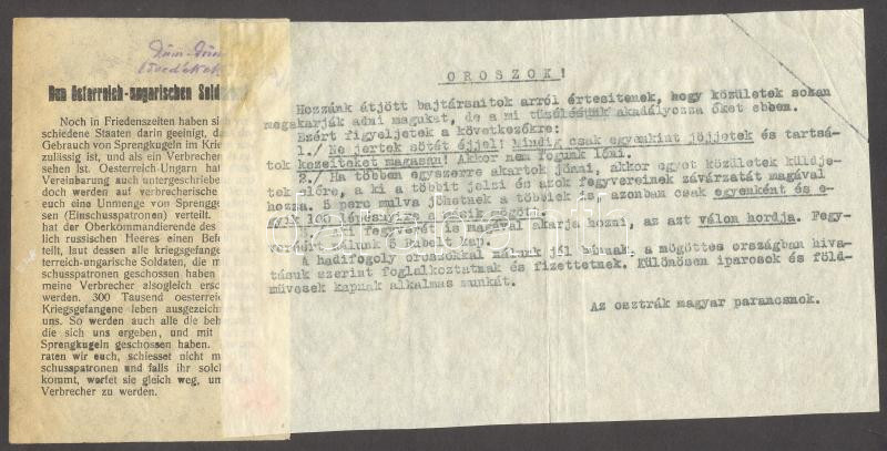 2 db röplapcédula Osztrák-Magyar katonáknak, Orosz katonáknak magyarul...