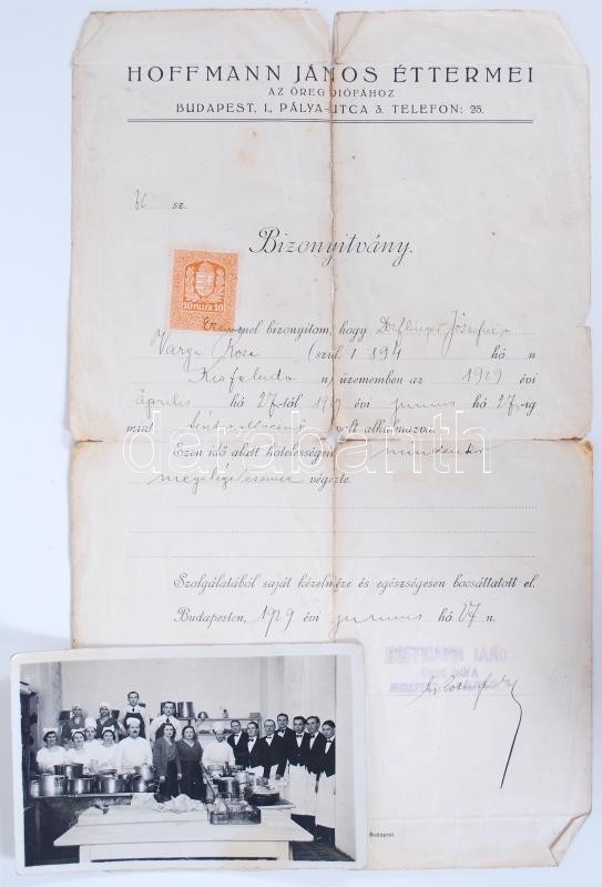 Budapest I. Öreg diófa étterem személyzete fotólap + okmány