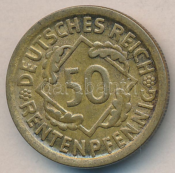 https://www.darabanth.com/en/179-Online-auction/179.0/Numismatics/Foreign-coins~300013/Nemet-BirodalomWeimari-Koztarsasag-1924D-50RPf-T2-2--3Cbr3EGermanyWeimar-Republic-1924D-50-Ren~II629611