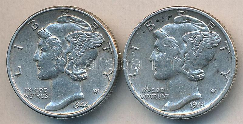 USA 1941. 1 Dime Ag "Mercury" + 1944. 1 Dime Ag "Mercury" C:XF