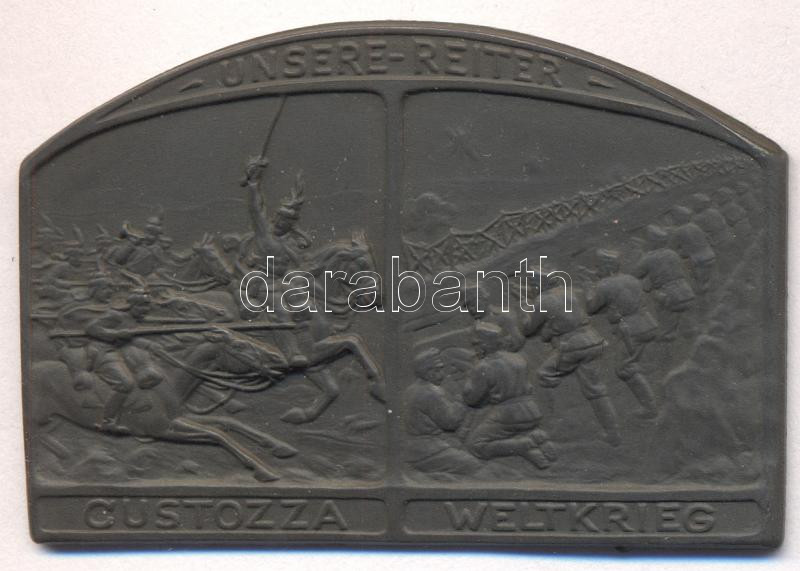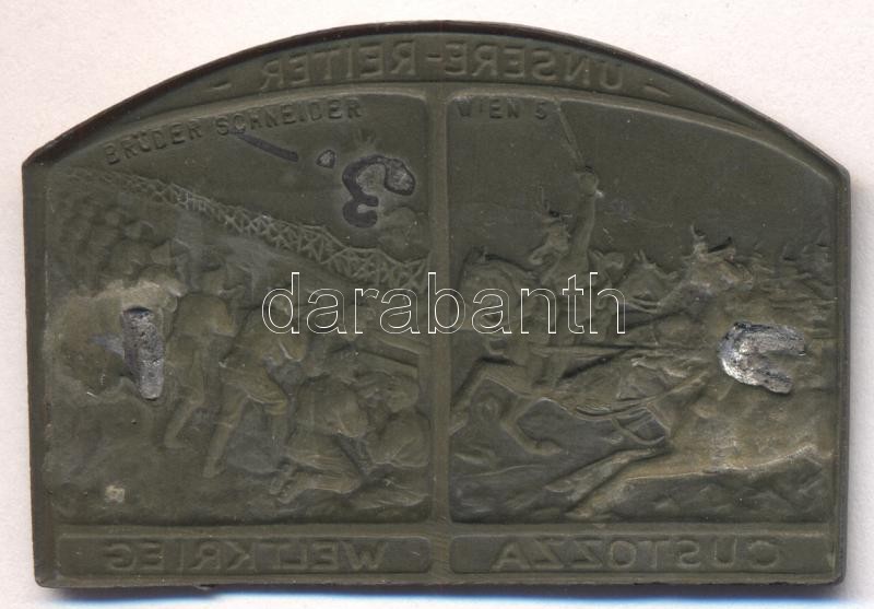 Osztrák-Magyar Monarchia 1918. "Unsere Reiter CUSTOZZA - Weltkrieg " cink sapkajelvény (34x50mm) készítő: Brüder Schneider Wien 5., tű nélkül T:1-