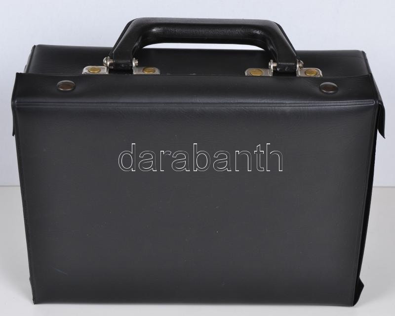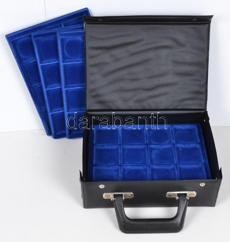 Műbőr borítású éremtartó bőrönd, 8db kivehető tálcával, egyenként 12db/50x50mm érem tárolására alkalmas, jó állapotban