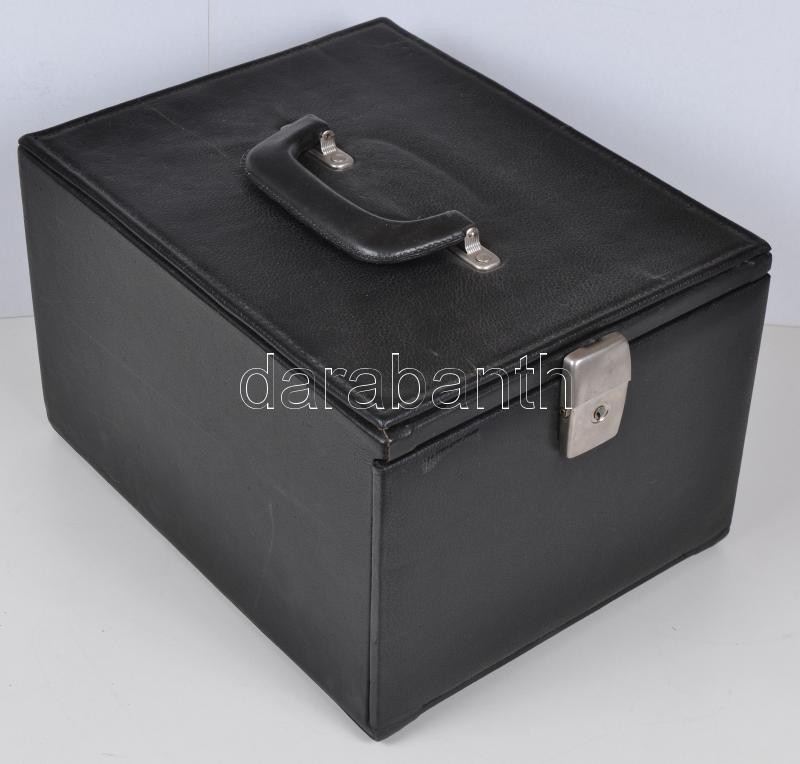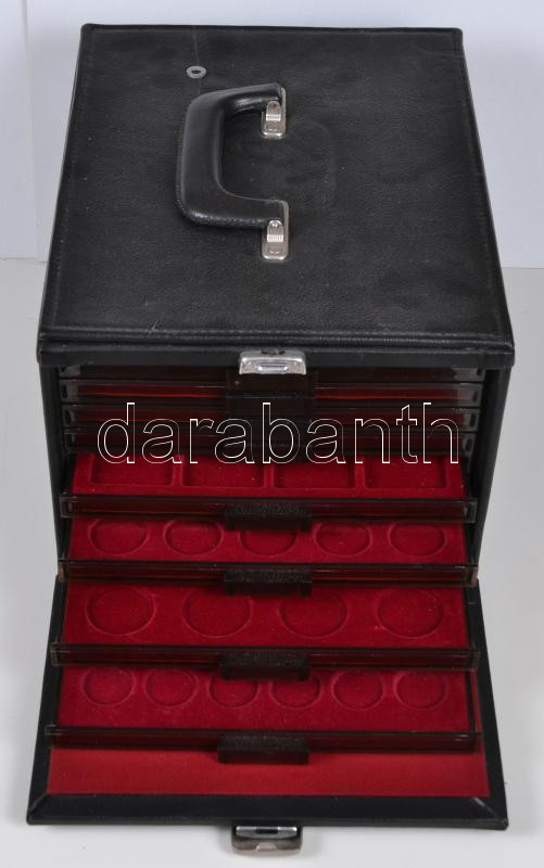 Nagyméretű éremtartó koffer, benne 8db Leuchtturm típusú éremtartó tálca, többféle méretű érme tárolására, kulcs nélkül