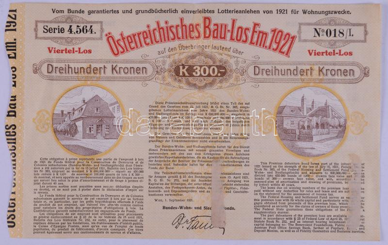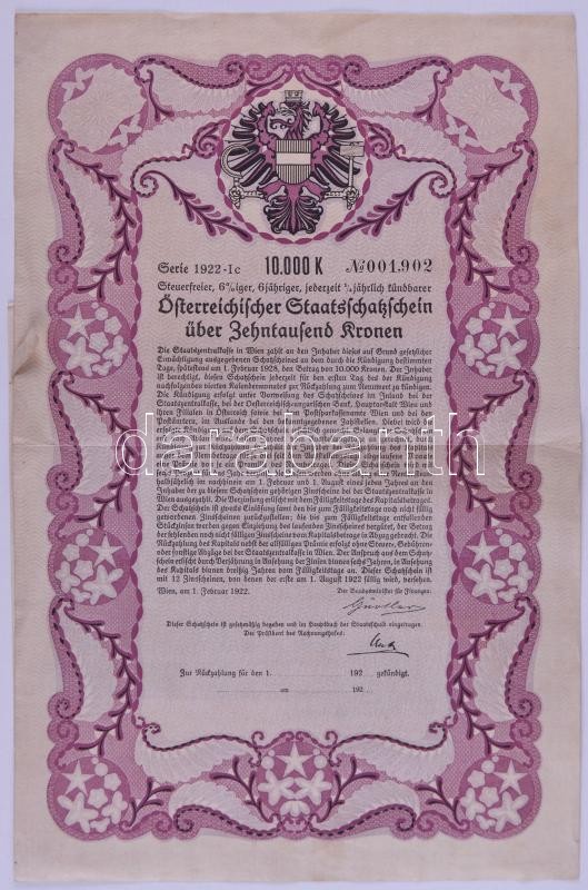 Austria / Vienna 1868. "Staatsschuldverschreibung" about 100/1000 Gulden with coupons C:folded,small tears + 1912. "Österreichische Staats-Rente-Obligation" about 200 Corona with coupons C:fold once + 1920. "Staatsschuldverschreibung" bond about 200 Corona without coupons + 1921. "Österreichisches Bau-Los Em.1921" premium debenture about 300 Corona C:bent once + 1922. "Österreichischer Staatsschatzschein" bond about 10.000 Corona C:fold once