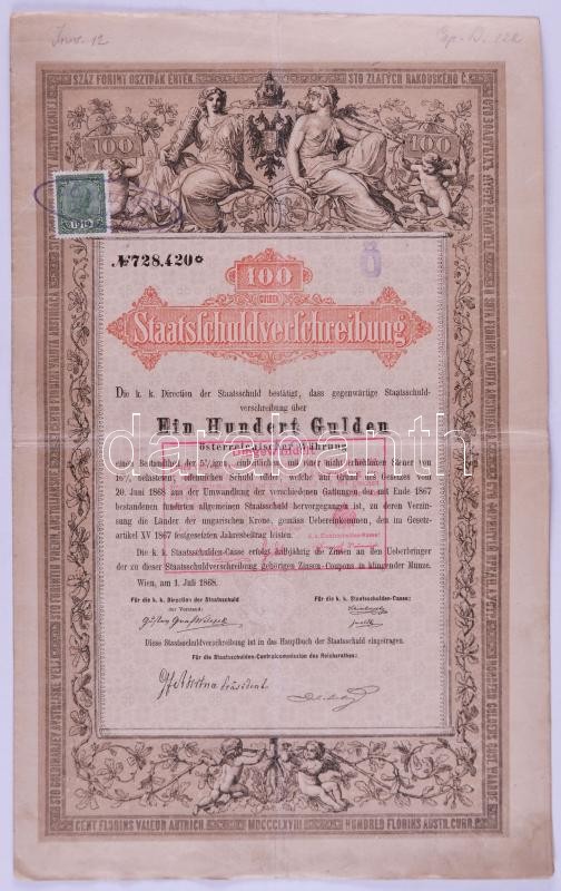 Ausztria / Bécs 1868. 2db Államadóssági kötvény 100/1000 Guldenről, sz...