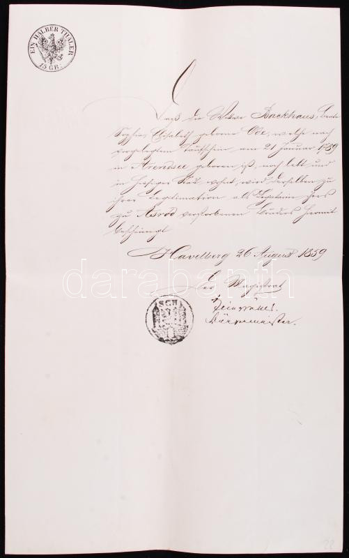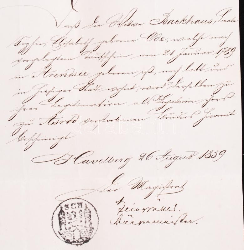 1859 Havelberg városi tanács által kiadott Bizonyítvány 15gr szignettá... https://www.darabanth.com/en/179-Online-auction/179.0/Other-collectibles/Documents~400021/1859-Havelberg-varosi-tanacs-altal-kiadott-Bizonyitvany-15gr-szignettaval-es-a-varos-polgar~II636676
