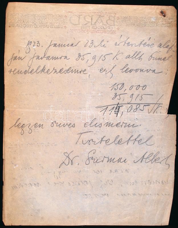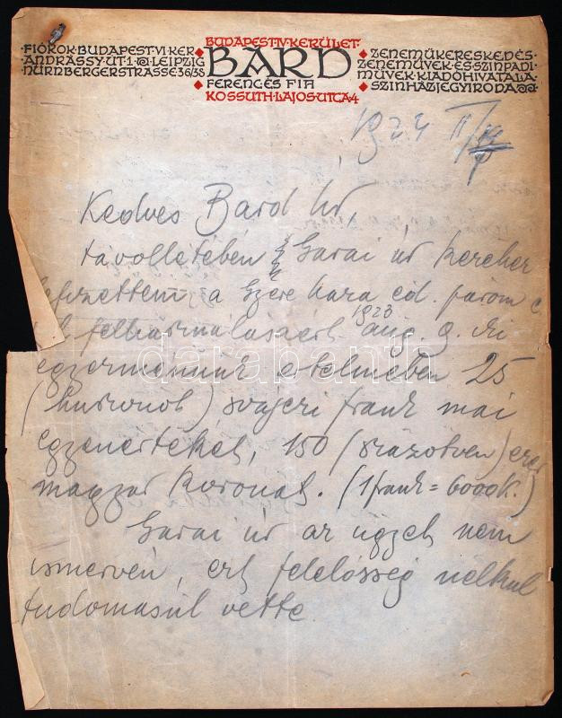 1924 Szirmai Albert (1880-1967) zeneszerző Bárd Ferenc és Fiának címzett levele honorárium ügyében