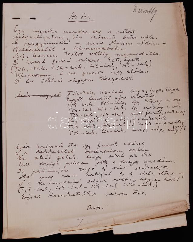 Karinthy Frigyes (1887-1938) "Az óra" című költeményének autográf kézi...