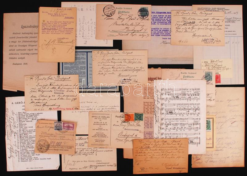 cca 1900-1930 Üzleti levelezés és egyéb dokumentumok, kéziratok a Bárd Ferenc és Testvére Zeneműkereskedés hagyatékából, összesen 27db
