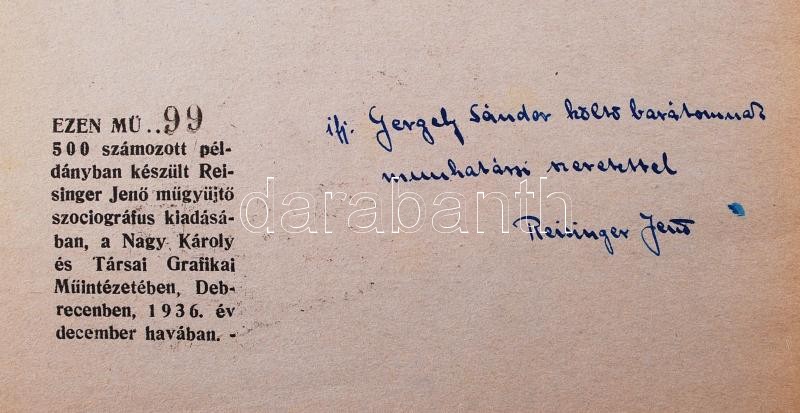 Description: Nagy István metszetei: Falusiak. Kodolányi János előszavával. Debrecen, 1936, Reisinger Jenő műgyűjtő szociográfus kiadása a Nagy Károly és Társai Grafikai Műintézetében. 99/500. számozott példány, a kiadó ajándékozó soraival, 25x18cm (2db metszet hiányzik)