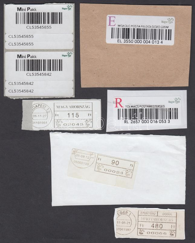 3 db rosszul beállított postai gépi bélyegzés + 2 db (E és R) ragjegy + 2 db Mini Pakk ragjegy
