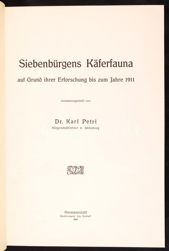 Description: Karl Petri: Siebenbürgens Käferfauna auf Grund ihrer Erforschung bis zum Jahre 1911. Hermannstadt, 1912. Jos. Drotleff. 376 hasábon / in 376 columns. Modern műbőr kötésben / In modern binding