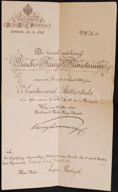 Description: 1887-1917 Egy katonaorvos pályafutása okmányokon. Egyetemi beiktató okmánya, vizsgaokmánya, majd hadseregbeli kinevezései. Először segédorvossá, ezredorvossá, törzsorvossá, majd II. osztályú főtörzsorvossá, a kinevezéseken /