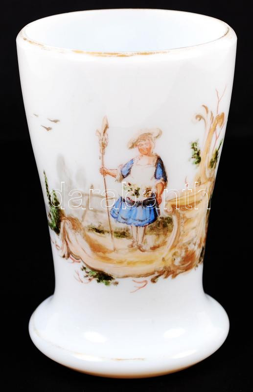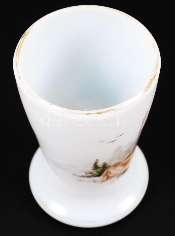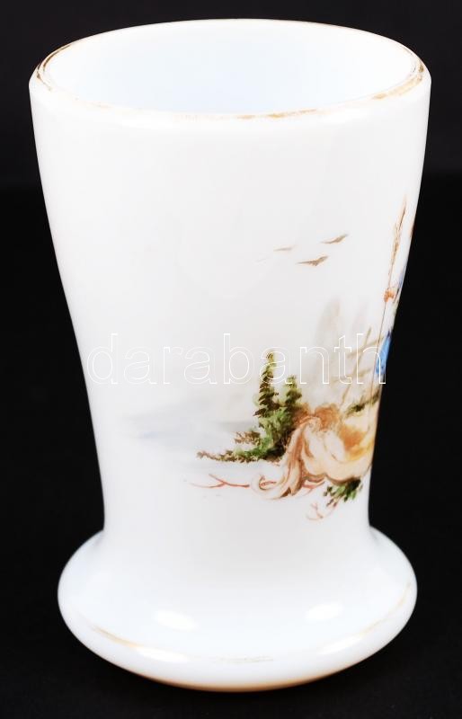 Antik emlékpohár, kézzel festett opálüveg, peremén kopott aranyozás, h...