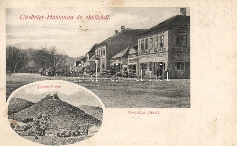 Homonna, Fő utca, Friedman Markus kereskedése, Jeszenői vár / main street, shop