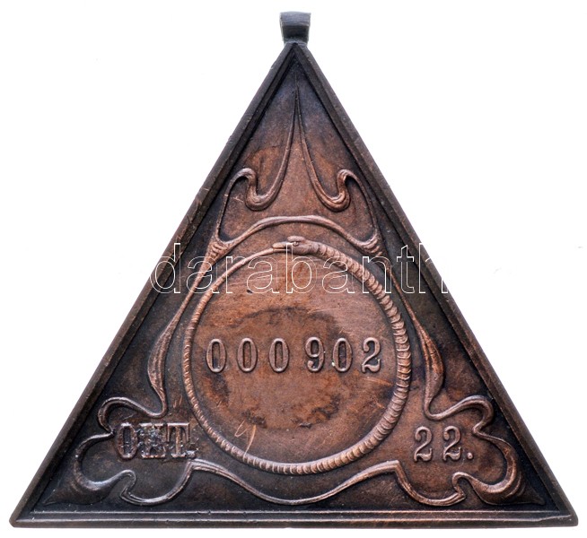 Description: 1902 október 22. A Hajnal Páholy megalakulásának emléket állító szabadkőműves háromszögletű bronz biléta "HAJNAL - BUDAPEST KEL / 000902 OKT 22." felirattal és sorszámmal ellátva (52x56mm/47.6g) T:2