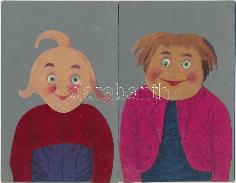 Max & Moritz 2 db W. Busch mesefigurás régi, textil képeslap / 2 cartoon postcards with textile decoration