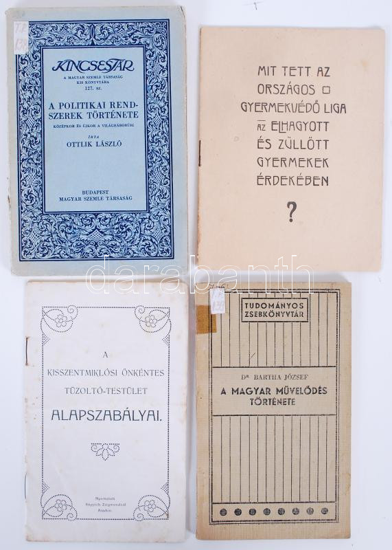 Description: 2 db kis könyv és 2 db füzet: A magyar művelődés története. A politikai rendszerek története. A Kunszentmiklósi önkéntes tűzoltó-testület alapszabályai. Mit tett az Országos Gyermekvédő Liga az elhagyott és züllött gyermekek érdekében.