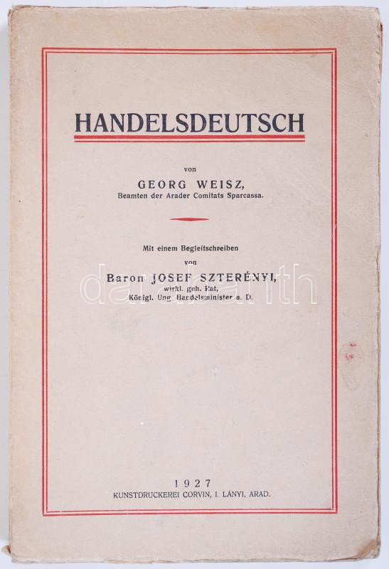Geor Weisz: Handeldeutsch. Arad 1928. Kunstdruckerei Corvin. A könyvben egy levél található a könyvkiadónak címezve.