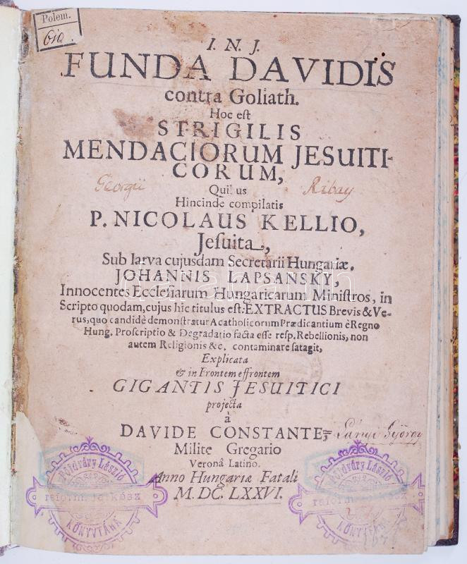 Johannis Lapsansky: Funda Davidis contra Goliath. Hoc est strigilis mendaciorum Jesuiticorum, quibus ... Nicolaus Kellio ... sub larva ... Johannis Lapsansky ... innocentes ecclesiarum Hungaricarum ministros, scripto quodam, cujus hic titulus est. Lipcse, 1648. 106p. hozzákötve: Andrea Schmalii: Adversaria ad illustrandam historiam evangelico-Hungaricam pertinentia c. munkájának magyar fordítása. Kézirat. 32p. hozzá még: Simonides, Johannes: Galeria Omnium Sanctorum c. munkájából kivonatos magyar nyelvű feljegyzések a XIX. sz végéről 26p. félbőr kötésben