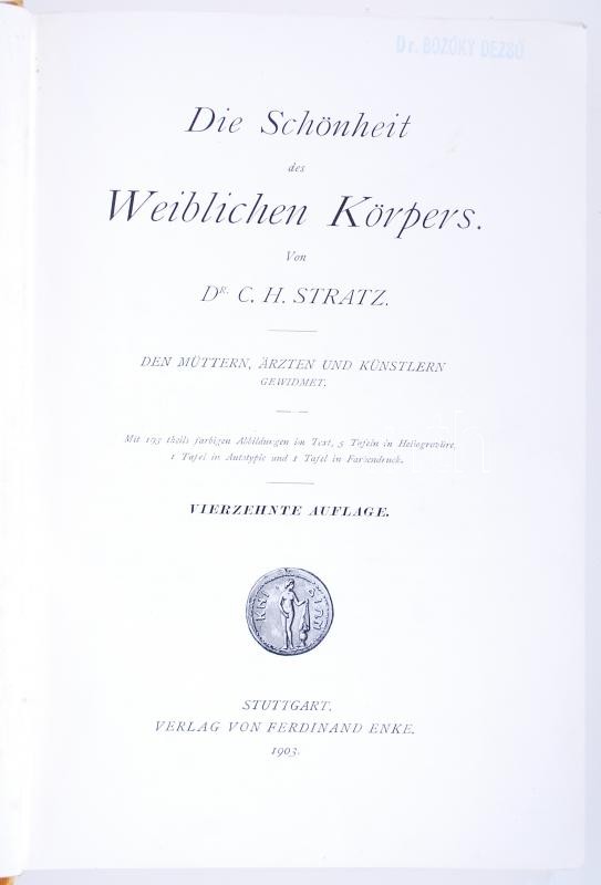 Carl Heinrich Stratz: Die Schönheit des weiblichen Körpers. Den Müttern, Aertzten und Künstlern gewidmet. Mit 193 theils farbigen Abbildungen im Text, 5 Tafeln in Heliogravüre, 1 Tafel in Autotypie und 1 Tafel in Farbendruck. 14. Aufl. Stuttgart, 1903, Ferdinand Enke. Kiadói szecessziós vászonkötésben, illusztrált, jó állapotú /