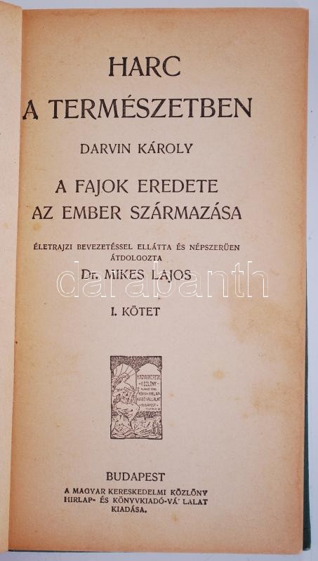 Darwin Károly: Harc a természetben I.-II. A fajok eredete az ember szá... https://www.darabanth.com/en/180-Online-auction/180.0/Other-collectibles/Books-Science-and-thechnology~400029/Darwin-Karoly-Harc-a-termeszetben-I-II-A-fajok-eredete-az-ember-szarmazasa-Bp-Magyar-ker-~II638905