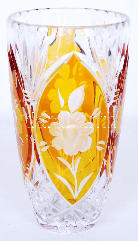 Mangán sárga ólomkristály váza, többrétegű, csiszolt, metszett, hámozo...