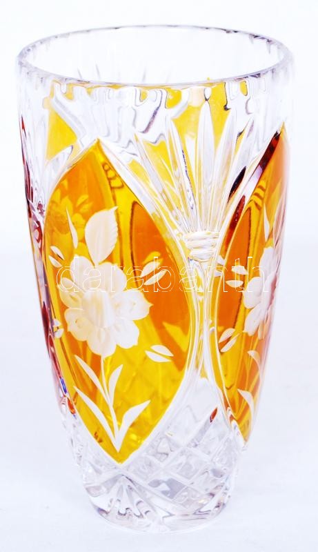 Mangán sárga ólomkristály váza, többrétegű, csiszolt, metszett, hámozott, hibátlan, m:21 cm/ Lead crystal vase