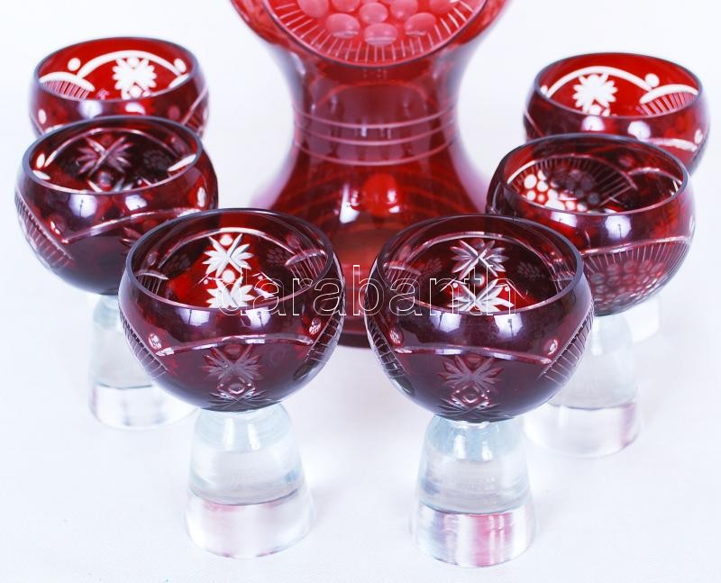 Rubin vörös likőrös készlet, többrétegű, csiszolt, hámozott, hibátlan, m:34 cm, m:10 cm/ Liqueur set