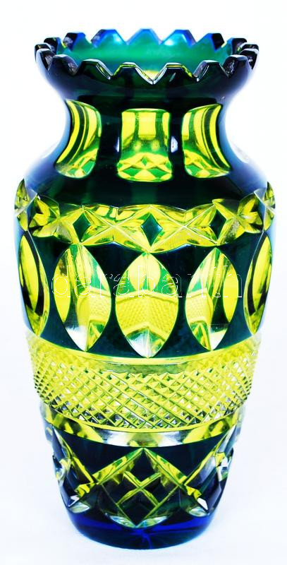 Urán zöld kristály váza, többrétegű, csiszolt, metszett, hámozott, hib...