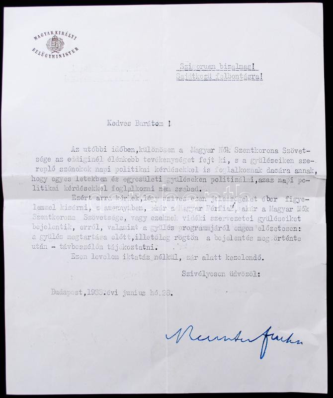 1933 Keresztes-Fischer Ferenc belügyminiszter aláírt szigorúan bizalmas levele, melyben a Magyar Nők Szentkorona Szövetségének megfigyelését kéri