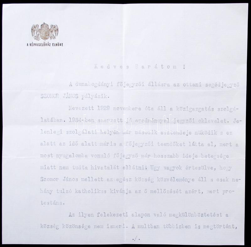 1944 Tasnádi Nagy andrás a képviselőház elnökének saját kézzel aláírt levele, melyben közben jár a dunabogdányi jegyző érdekében