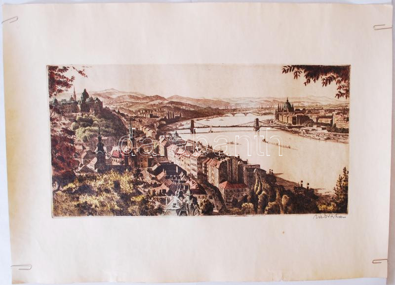 Zádor István (1882-1963): Budapest és Tabán. Színezett rézkarc, papír,...