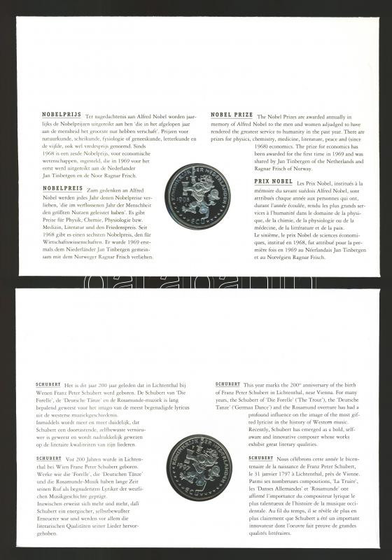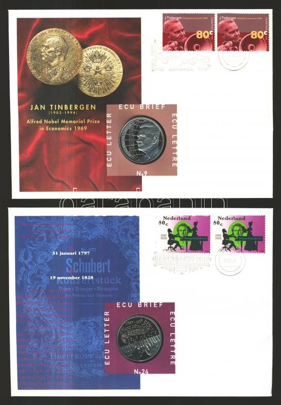 Hollandia 1995. Ecu "Nóbel-díj" + 1997. "Schubert" 2db érmés boríték alkalmi bélyegzős bélyegpárral, hátoldali ismertetővel T:PP