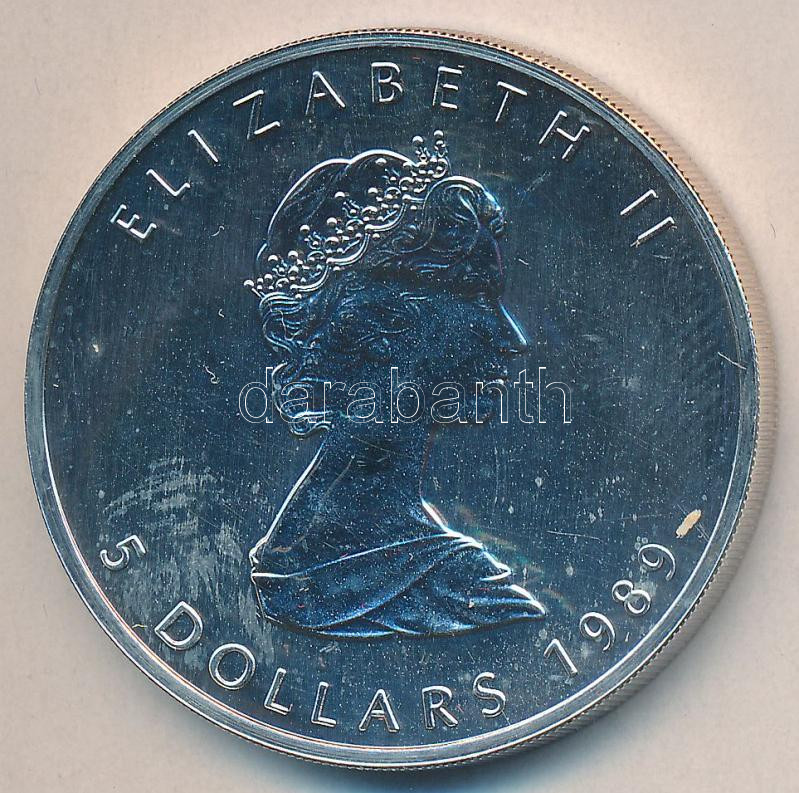 Description: Kanada 1989. 5$ Ag "II. Erzsébet / Juharlevél" (1oz/0.999) laminált fóliában T:BU