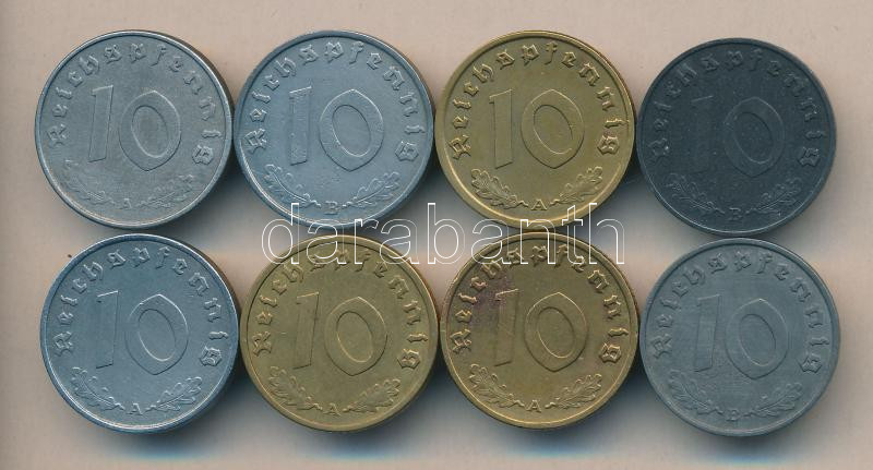 Német 3. Birodalom 1937-39. 10Pf (3x) klf + 1941-44. 10Pf (5x) klf T:2... https://www.darabanth.com/en/181-Online-auction/181.0/Numismatics/Foreign-coins~1000395/Nemet-3-Birodalom-1937-39-10Pf-3x-klf-plus-1941-44-10Pf-5x-klf-T2-2--3Cbr3EGerman-Third-Reich-~II623113