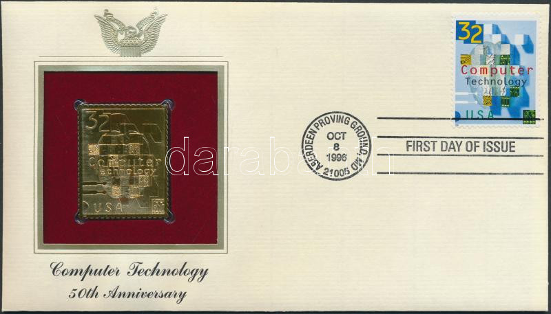 Amerikai Egyesült Államok 1996. "Számítástechnika 50. évforduló 32c" aranyfóliás(22kt) bélyeg replika FDC borítékban, a megegyező bélyeggel,elsőnapi bélyegzővel és ismertetővel T:1