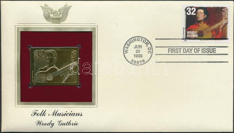 Amerikai Egyesült Államok 1998. "Népdalénekesek / Woody Guthrie 32c" aranyfóliás(22kt) bélyeg replika FDC borítékban, a megegyező bélyeggel,elsőnapi bélyegzővel és ismertetővel T:1
