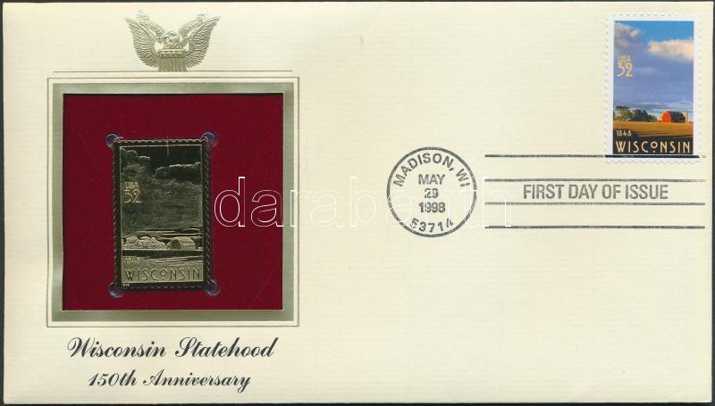 Amerikai Egyesült Államok 1998. "Wisconsin állam 150 éves 32c" aranyfóliás(22kt) bélyeg replika FDC borítékban, a megegyező bélyeggel,elsőnapi bélyegzővel és ismertetővel T:1