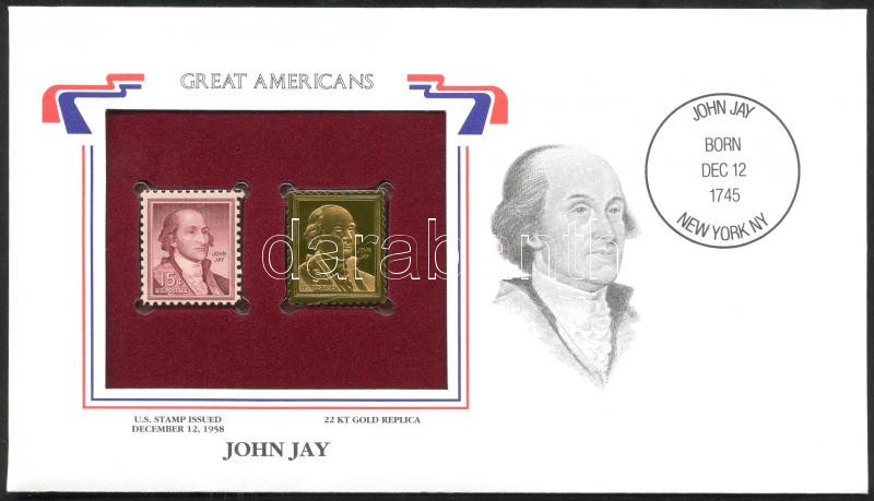 Description: Amerikai Egyesült Államok/"Nagy Amerikaiak" 1958. "John Jay 15c"- 22K aranyfóliás bélyeg replika és bélyeg borítékban angol nyelvű tájékoztatóval T:1