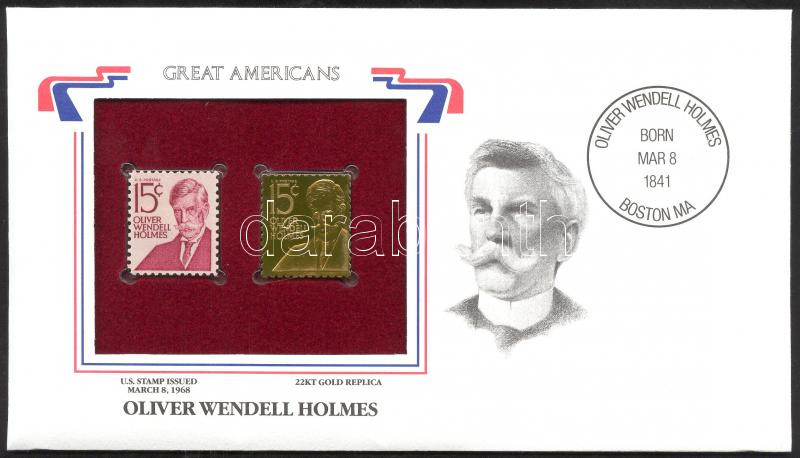 Description: Amerikai Egyesült Államok/"Nagy Amerikaiak" 1968. "Oliver Wendell Holmes 15c"- 22K aranyfóliás bélyeg replika és bélyeg borítékban angol nyelvű tájékoztatóval T:1