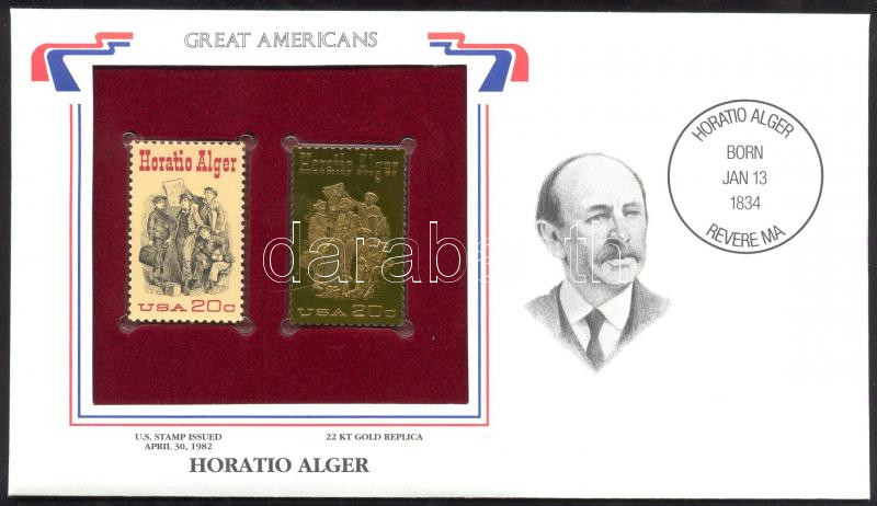 Description: Amerikai Egyesült Államok/"Nagy Amerikaiak" 1982. "Horatio Alger 20c"- 22K aranyfóliás bélyeg replika és bélyeg borítékban angol nyelvű tájékoztatóval T:1