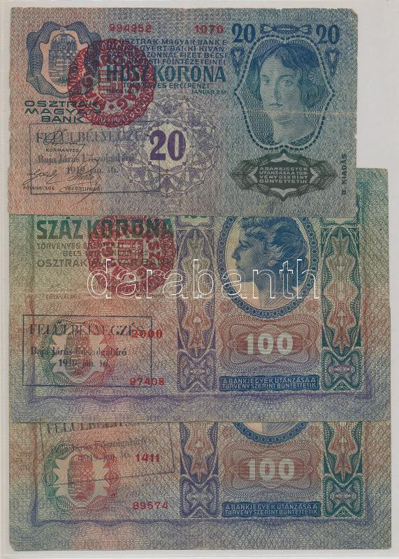 1912. 20K + 100K "Magyarország" körbélyegzéssel (egy kivételével) + mindegyiken "FELÜLBÉLYEGZÉS - BAJA JÁRÁS FŐSZOLGABÍRÓ - 1919. JAN. 16." pecsételéssel T:III,III-