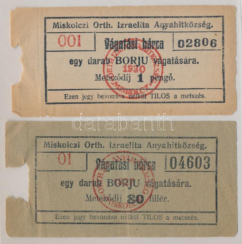 1930. 1P + 80f "Miskolczi Orth. Izr. Hitközség" vágatási bárca T:III