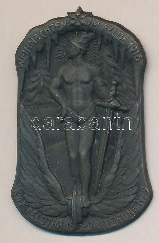 Austro-Hungarian Monarchy 1916. "WEICHNACHTEN IM FELDE 1916 - K.u.K. FELDTRANSPORTLEITUNG No.9" zinc cap badge (42x26mm) maker: Arkanzas Bp., without pin C:XF