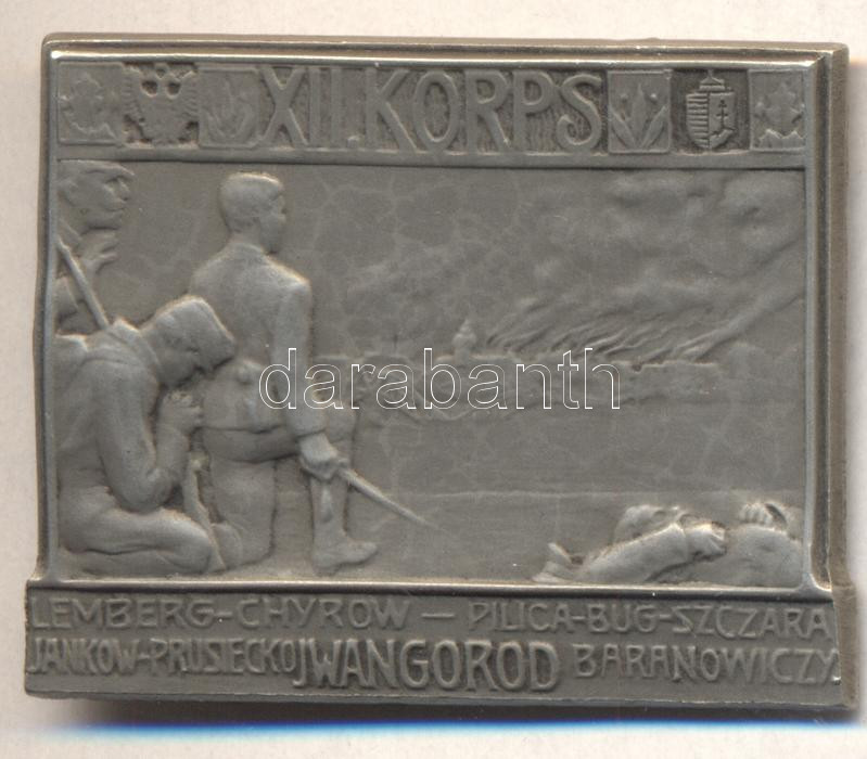 Austro-Hungarian Monarchy ~1916. "XII. KORPS - LEMBERG-CHYROW-PILICA-BUG-SZCZARA-JANKOW-PRUSIECKO - IWANGOROD - BARANOWICZY" silvered zinc cap badge (30x37mm) maker: "Nach Entwurf v. H. Krippel Aus...Atel.Gurschner Wien VII/2", without pin C:XF