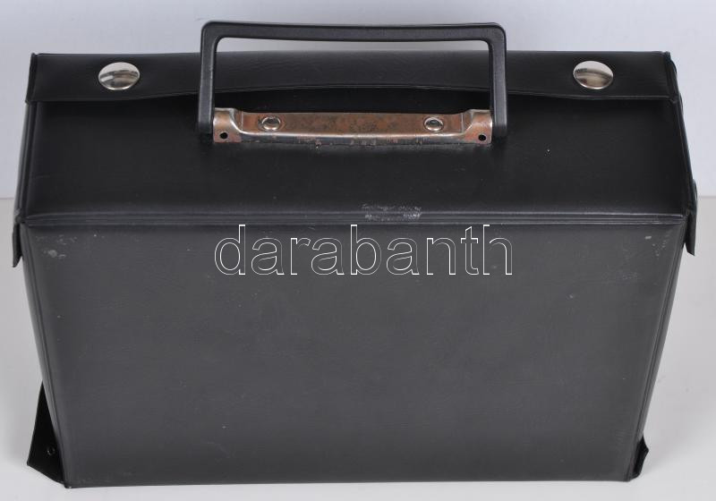 Műbőr borítású éremtartó bőrönd, 8db kivehető tálcával, ebből 7db 12x50x50mm és 2db 16x35mm/24x30mm érem tárolására alkalmas, jó állapotban